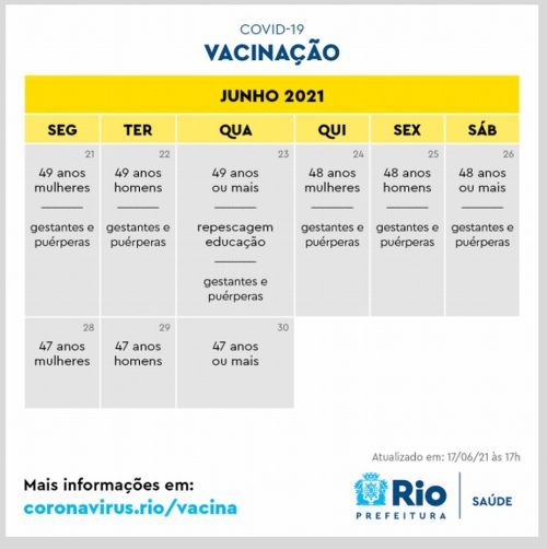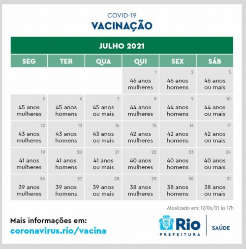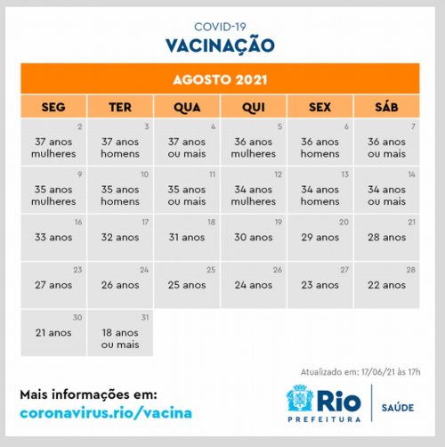 O prefeito do Rio de Janeiro, Eduardo Paes, antecipou o calendário e anunciou que vai vacinar toda a população acima de 18 anos até o dia 31 de agosto. (veja o calendário abaixo)