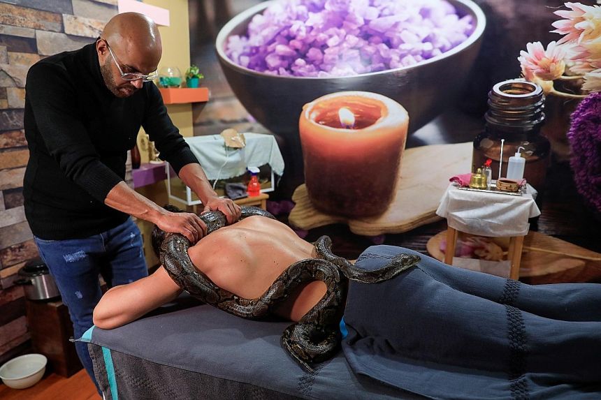 Segundo os profissionais da área basta relaxar e deixar os répteis fazerem seu trabalho. Essa massagem se tornou muito popular na Indonésia, Filipinas, Tailândia, Israel e Rússia.