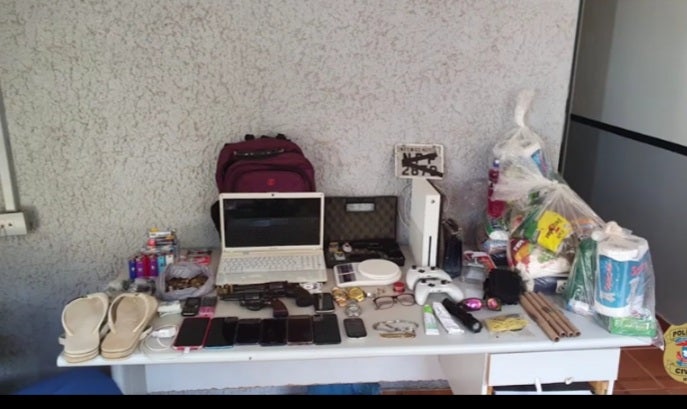 No local, onde foi cumprido o mandado de busca e apreensão determinado pela justiça, os policiais encontraram três armas, munições, diversos celulares, notebook, um aparelho de videogame entre outros objetos que foram levados no assalto numa churrascaria. Uma das armas, foi levada da empresa e o proprietário tem o registro.