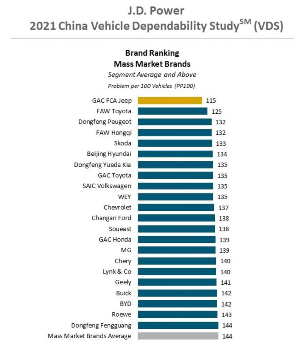 Na pesquisa, a diferença entre as duas categorias foi de apenas 5/PP100. Jeff Cai, Diretor da Divisão Automotiva da subsidiária chinesa da JD Power, diz: “O fato de as marcas de luxo estarem perdendo sua vantagem em confiabilidade apenas sugere que os fabricantes não estão atendendo às expectativas crescentes dos clientes chineses”.