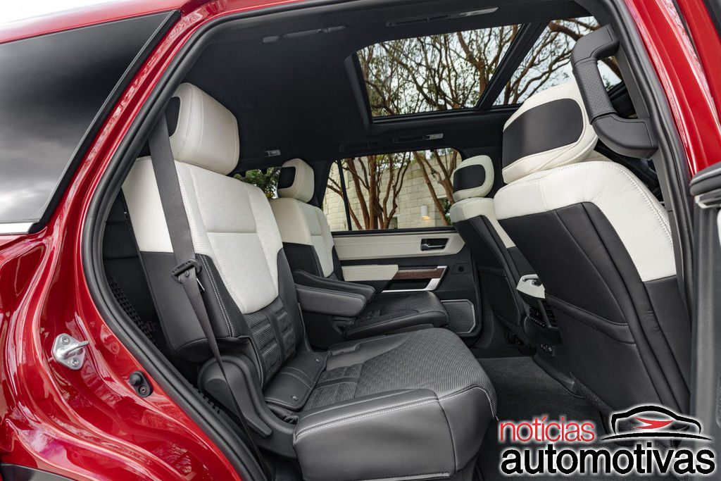 Equipada com multimídia em tela de 14 polegadas, o Toyota Sequoia 2023 tem ainda monitoramento em 360 graus, teto solar panorâmico e bancos dianteiros e traseiros com aquecimento.