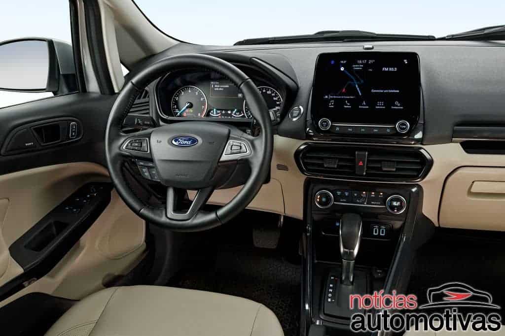 Por dentro, o painel do EcoSport destacava a multimídia SYNC 2.5 ou 3. Ela tinha tela de 7 polegadas ou 8 polegadas, com o ar condicionado automático posicionado abaixo. No volante, comandos de mídia, telefonia, computador de bordo e piloto automático.