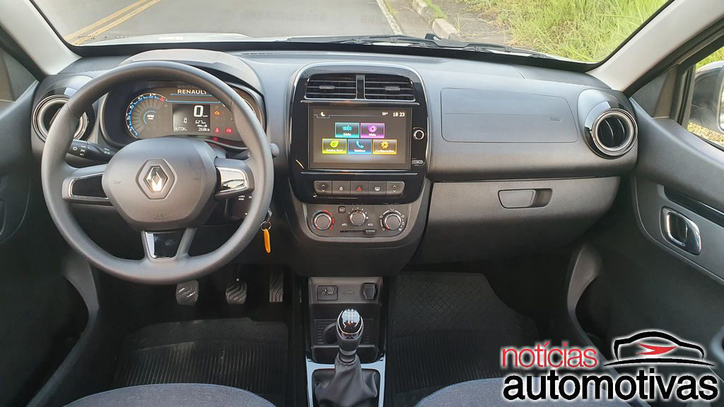 O Renault Kwid 2023 apresenta um ambiente interno levemente modificado, com destaque para os comandos de mídia e telefonia na coluna de direção, trazidos de outros da marca.