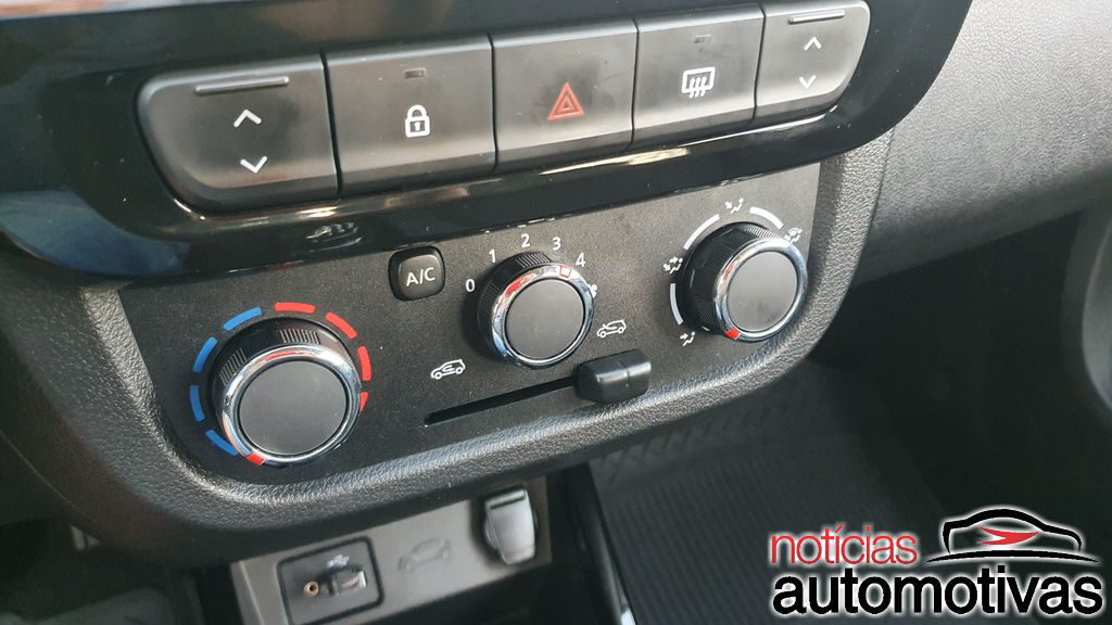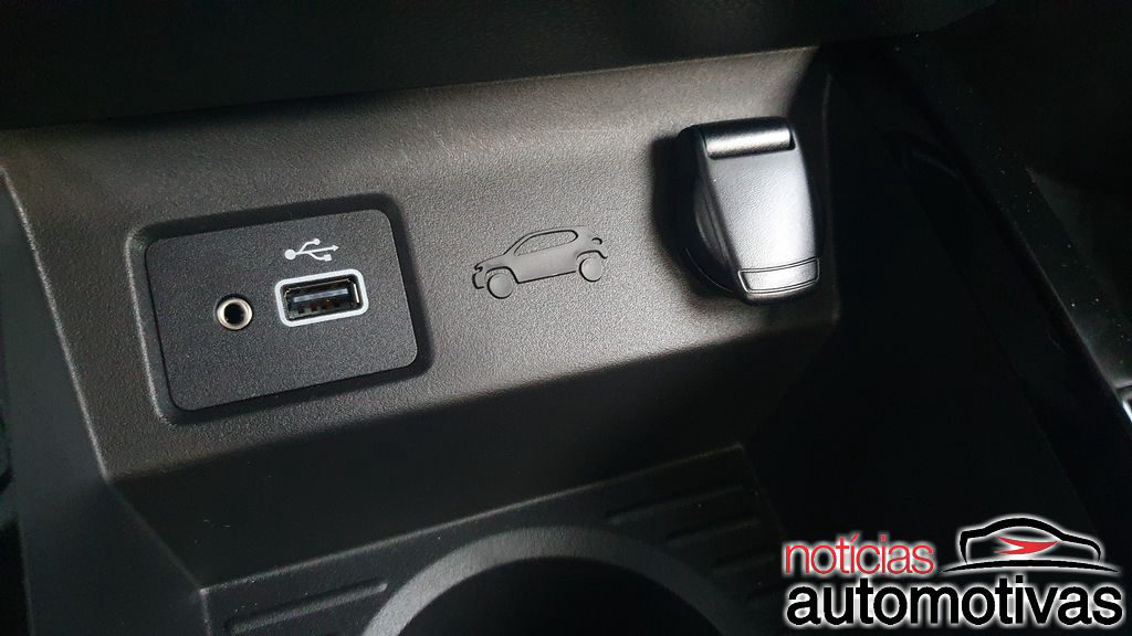 Câmera de ré, contudo, se fez presente com sua lente no centro do losango. Abaixo, o ar condicionado é suficiente e o slot com USB e fonte 12V tem até a forma do carrinho.