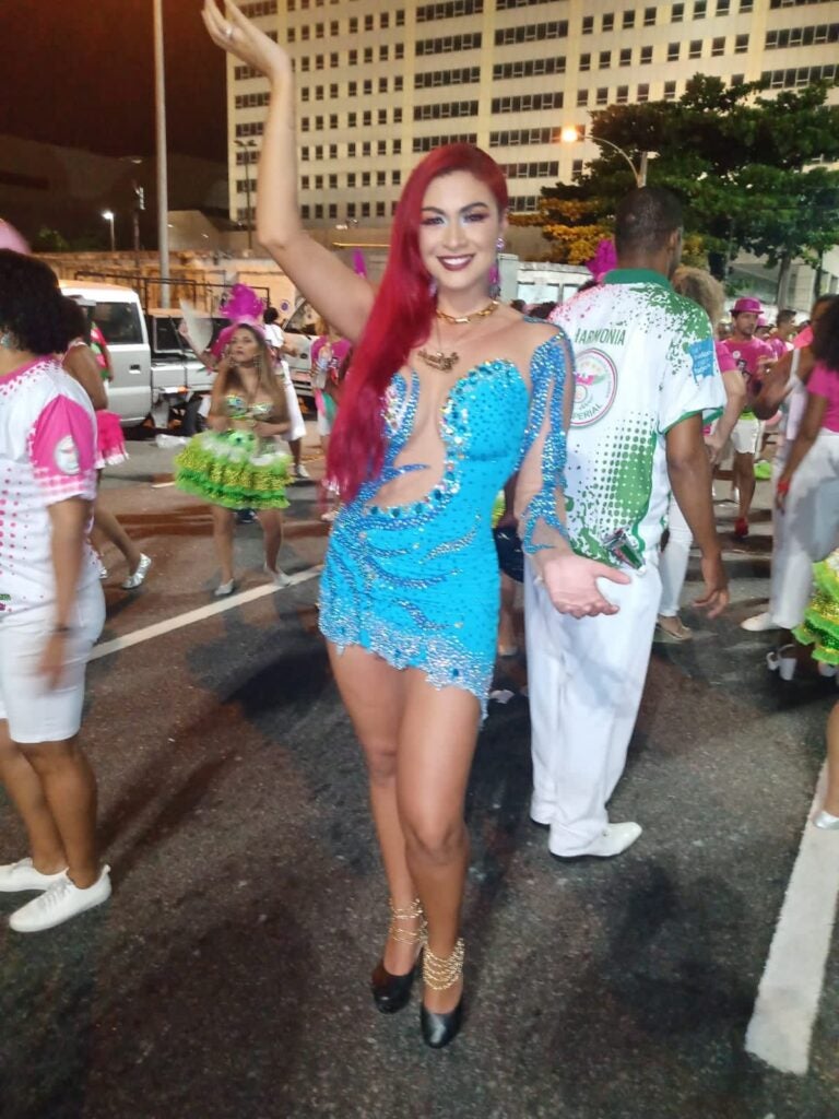 A atriz de pegadinhas do João Kleber mostrou todo o seu samba no pé durante a apresentação da escola de samba da Série Ouro. Ela conta que estava sentindo falta de toda energia da Avenida.