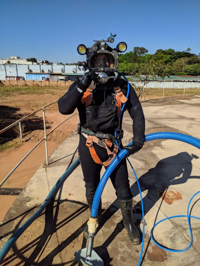 Todo o trabalho é acompanhado por um mergulhador supervisor, que de fora do reservatório monitora o serviço e assiste em tempo real ao que está acontecendo embaixo d’água, garantindo a segurança da operação. Essa comunicação permite a solicitação de alguma ferramenta ou de mais mangueira para ampliar a área de atuação.