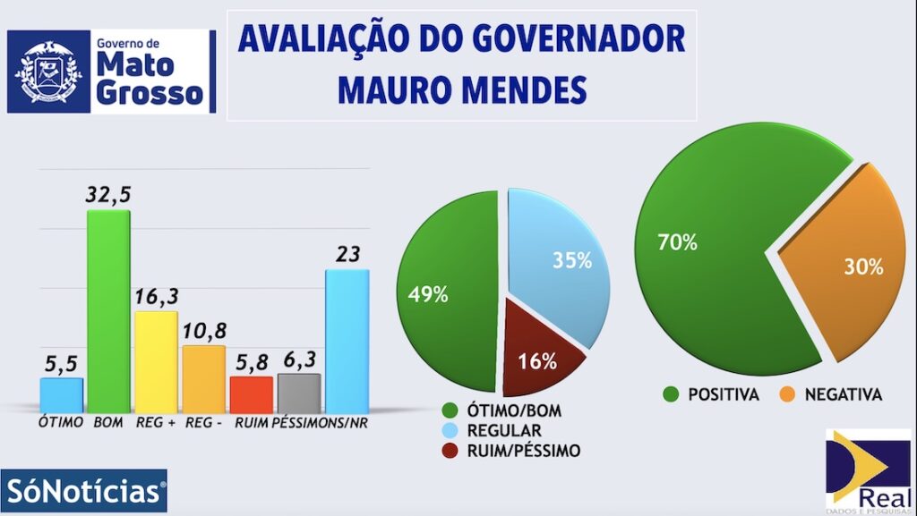 A gestão do governador Mauro Mendes, em Sinop é considerada positiva por 72% dos entrevistados na pesquisa Real Dados/Só Notícias. 30% consideram que é negativa.