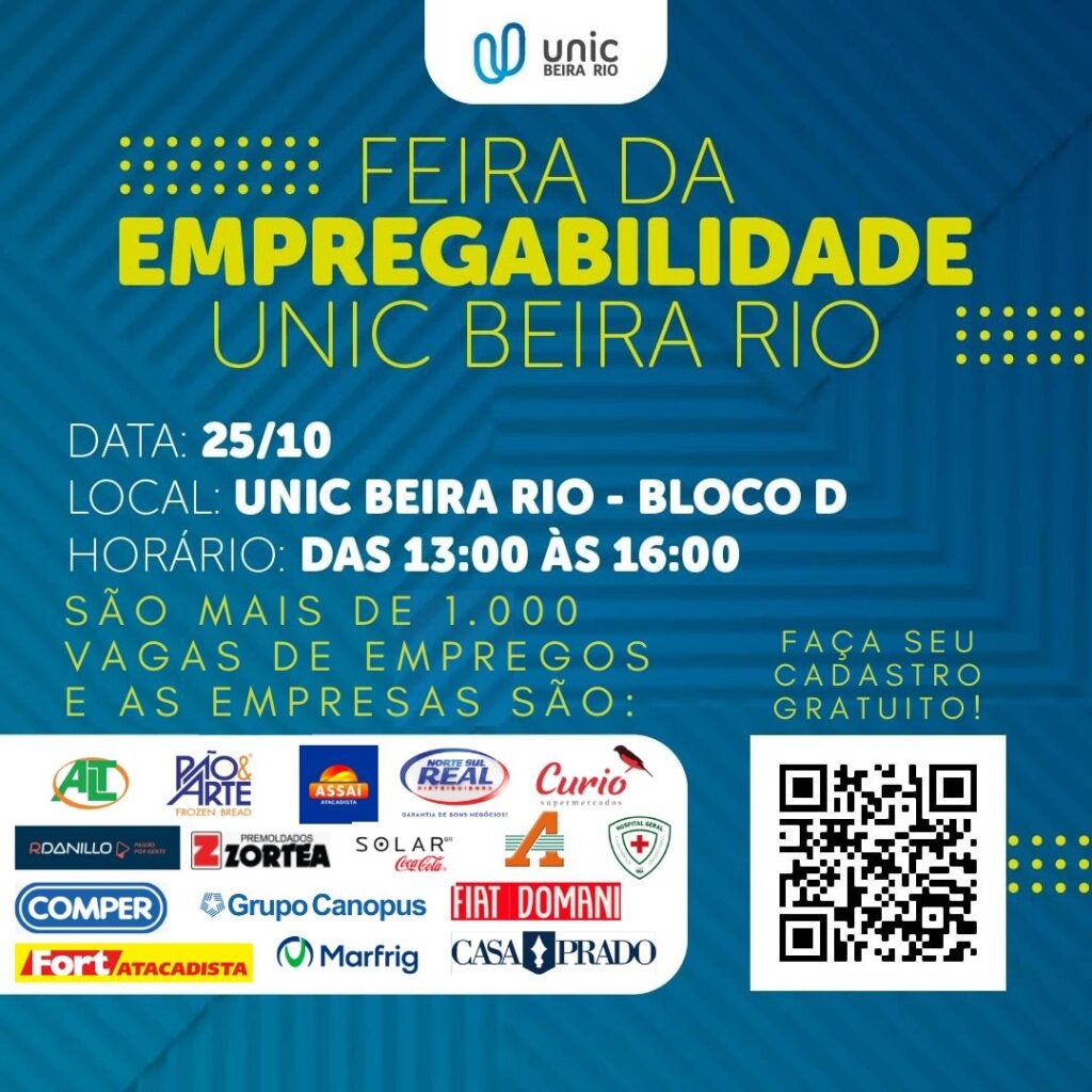 No dia 25 de outubro, a Unic Beira Rio realizará a 7ª edição da Feira da Empregabilidade reunindo empresas de diversos segmentos, com mais de mil e oitocentas ofertas de emprego e estágio disponíveis no mercado.