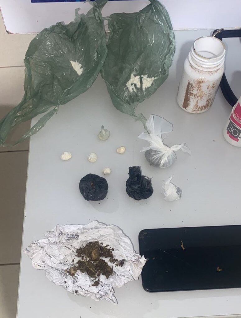 Perante as atitudes suspeitas, os policiais foram averiguar o motivo que as pessoas se ausentaram do local, ao entrar no local (residência), foi visto que, uma menor havia jogado uma bolsa do outro lado do muro e também ao fazerem uma revista na residência um rapaz de 19 anos, estava escondido dentro de um banheiro da casa, o mesmo havia jogado em um cômodo da casa uma frasco contendo duas trouxinhas de uma substancia embranquecida, aparecendo ser cocaína e duas trouxas de tamanho maior com uma substancia esverdeada aparentando ser maconha.
