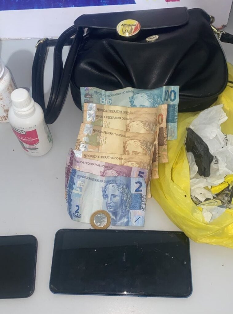 Na bolsa que a jovem de 16 anos arremessou por cima do muro em seu interior havia cinco invólucros contendo um produto embranquecido aparentando ser pasta base de cocaína e mais três porção média de uma substancia aparentando ser maconha, ainda havia um celular de cor azul da marca LG.