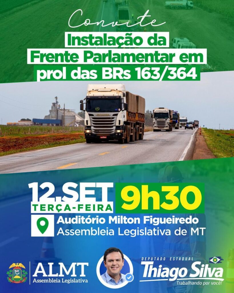O deputado estadual Thiago Silva (MDB) realizará a instalação da Frente Parlamentar em Prol da BR-163/364, nesta terça-feira (12), às 9h30, no Auditório Milton Figueiredo da Assembleia Legislativa, que contará com a participação de mais oito parlamentares. A proposta atende o requerimento de n.º 214/2023 e vai promover discussões sobre as obras na rodovia, fiscalizar, cobrar manutenções, apontar pontos que necessitam de travessias urbanas – como trincheiras, passarelas e viadutos -, para garantir melhorias na logística aos usuários.