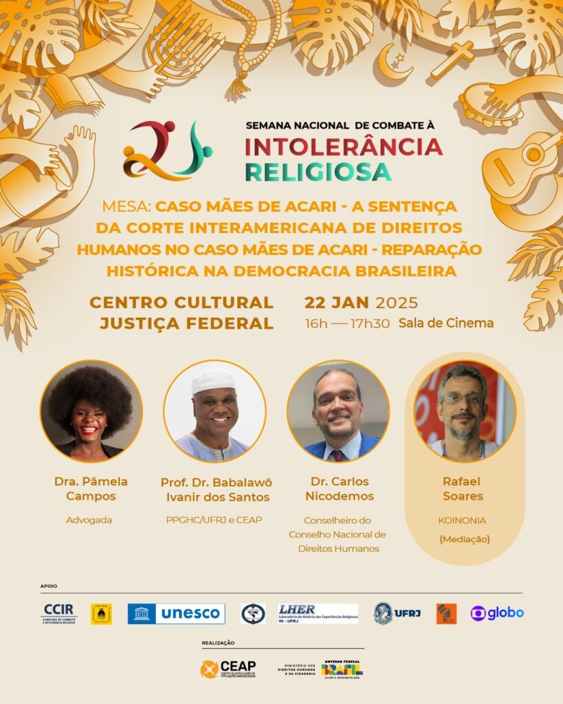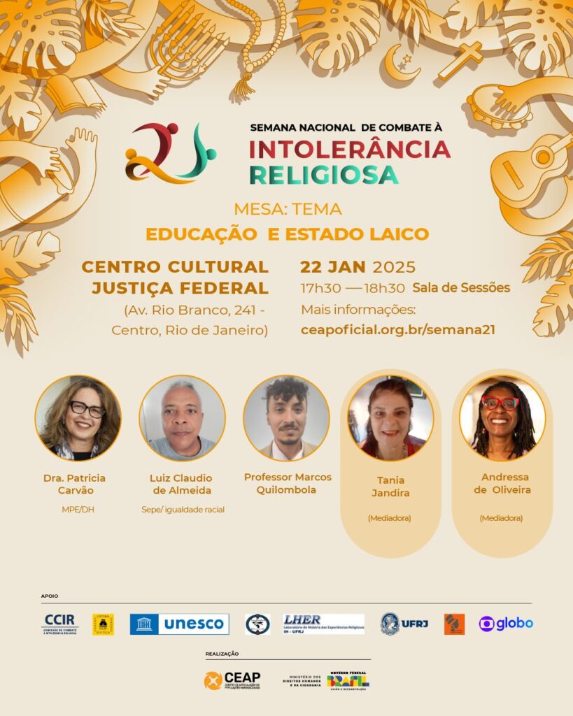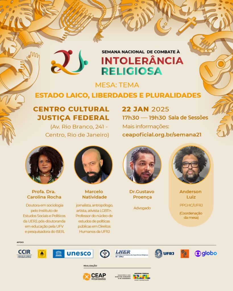 Semana Nacional de Combate à Intolerância Religiosa Dias 21 e 22 de janeiro Mesa de debates no CCJF Entrada Franca Com lideranças religiosas e acadêmicos