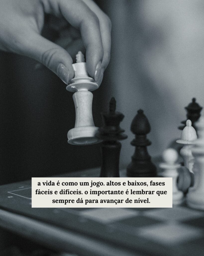 tantos outros momentos em que você vê tanta dificuldade em seguir em frente que tem vontade de desistir de tudo. “desinstalar”. e quantas vezes não fazem isso? mas você não. está aqui ainda. “jogando”, não é mesmo? esse jogo que só vai acabar quando você mesmo terminar. já parou para pensar como a vida é isso? como ela é feita de fases iguais a um jogo de celular? mas que você sempre, de uma forma ou de outra, passa de nível e segue jogando? que desistir é uma besteira e que não importa a dificuldade você sempre vai seguir jogando porque lá na frente vão ter níveis mais fáceis? e vai ser esse eterno sobe e desce? então relaxa, olha o tanto que você já brincou até agora. olha para frente e continua. o jogo da vida nunca acaba.