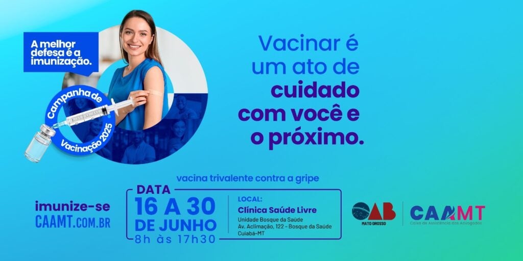 A Caixa de Assistência dos Advogados de Mato Grosso (CAA/MT) e a Ordem dos Advogados do Brasil – Seccional Mato Grosso (OAB-MT) informam que a campanha de vacinação trivalente contra a gripe continua em Cuiabá até o dia 30 de junho.