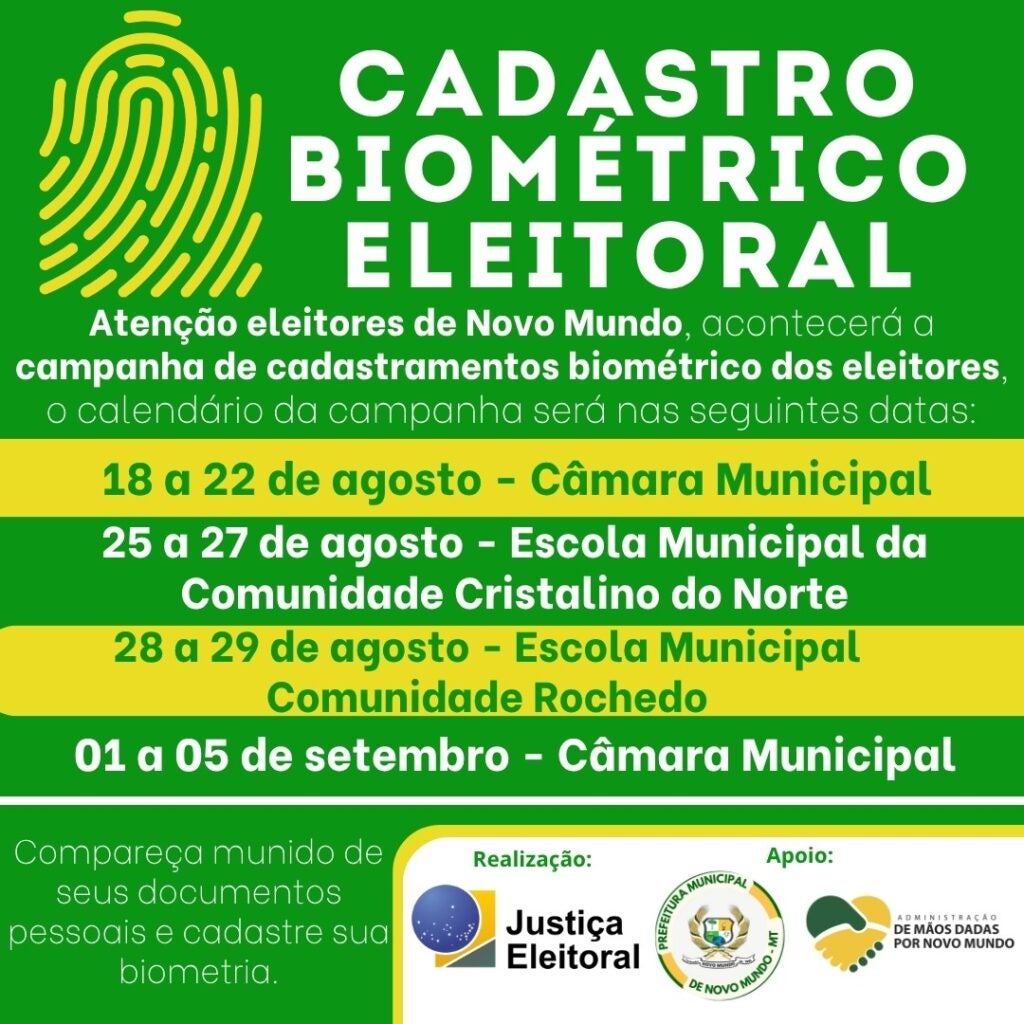 Uma série de mutirões será realizada nas zonas urbana e rural de Novo Mundo, município localizado a 741 km de Cuiabá, com o objetivo de ampliar o cadastramento biométrico de eleitores e eleitoras. A ação intensiva se faz necessária, pois, atualmente, o índice de cobertura da biometria na cidade está em 48,09%, o segundo mais baixo do estado de Mato Grosso.