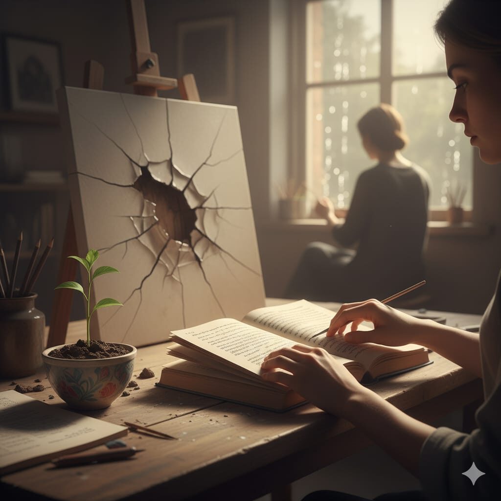 Mas crescer também é isso: continuar. Continuar acreditando naquilo que sobreviveu. Continuar se dispondo mesmo após se decepcionar. Continuar lendo, criando, amando, mesmo quando o livro tem páginas riscadas, quando o quadro está trincado, quando o outro já provou que não quer ver. Crescer é ir para a rua mesmo sabendo que pode chover, é colocar os pés no cimento frio da realidade e continuar.