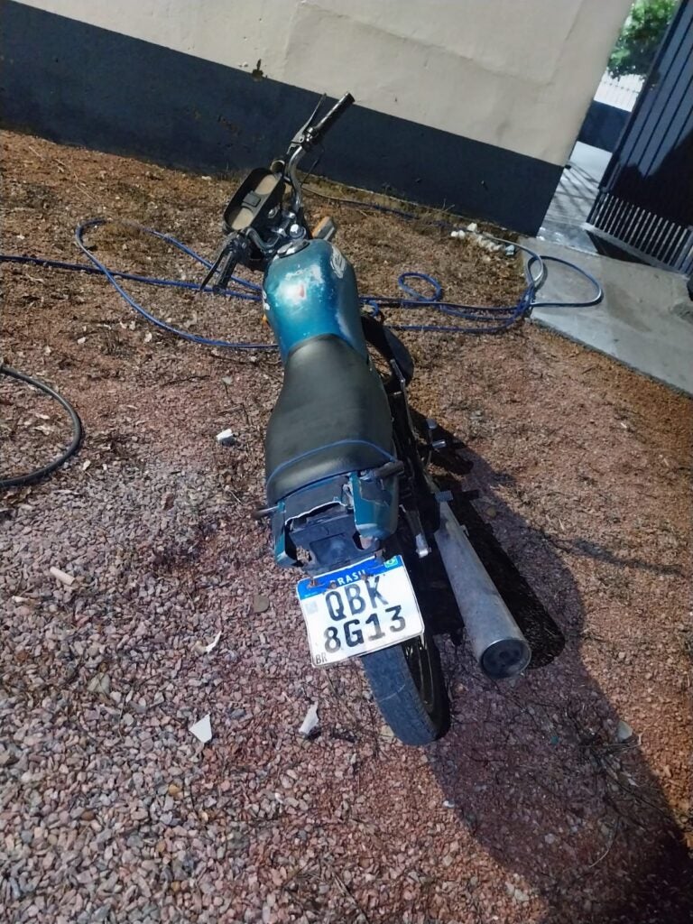 Após acompanhamento e cerco policial, a Policia Militar, abordou e constatou ser um menor de15 anos. O mesmo foi conduzido e aos fazer uma averiguação mais detalhada foi constatado que a motocicleta CG, estava com uma placa de uma motocicleta Biz.