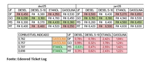 Dados da mais recente análise do Índice de Preços Edenred Ticket Log (IPTL), levantamento que consolida o comportamento dos preços praticados nos postos de combustível a partir das transações registradas, mostram que, em janeiro, o Centro-Oeste apresentou aumentos generalizados nos combustíveis em comparação com dezembro.