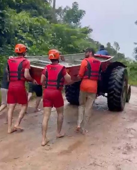Ao se aproximarem do local, as equipes constataram que as estradas de acesso já estavam completamente alagadas, impossibilitando a passagem de veículos. Diante da situação, os militares, com apoio de servidores da Defesa Civil do município, precisaram percorrer cerca de três quilômetros em meio às áreas inundadas. Durante o trajeto, a embarcação utilizada no resgate foi transportada por trechos de “terra firme”, de forma manual e mais próximo do sitio, contando com o auxílio de um trator que operava nas proximidades.